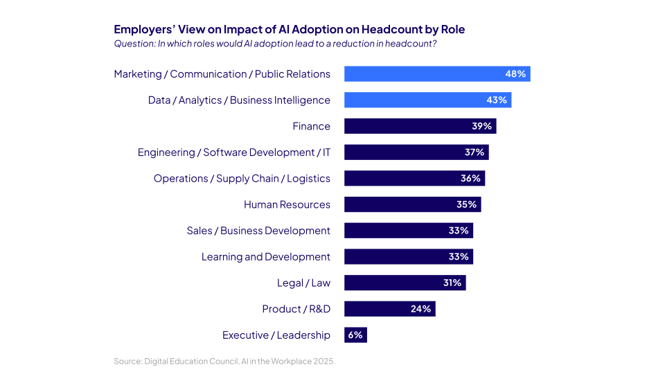 According to the Digital Education Council’s AI in the Workplace 2025 report, 72% of employers believe that AI adoption will reduce the headcount required in the workforce.