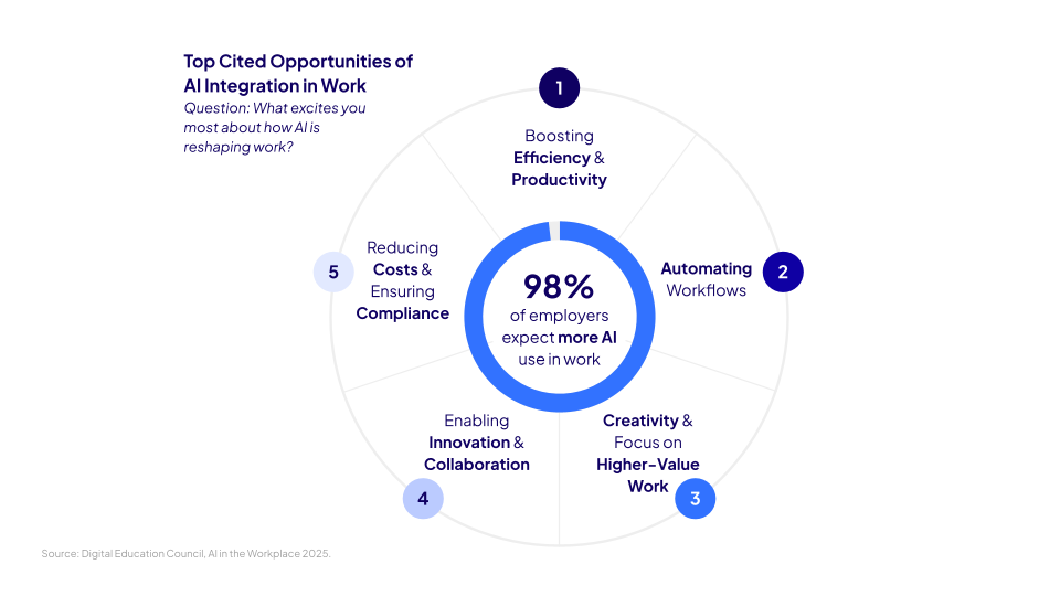 Nearly all employers (98%) expect AI use to increase within their teams and organisations as they look to capture the broad opportunities AI presents, specifically in boosting efficiency and productivity, and automating workflows.